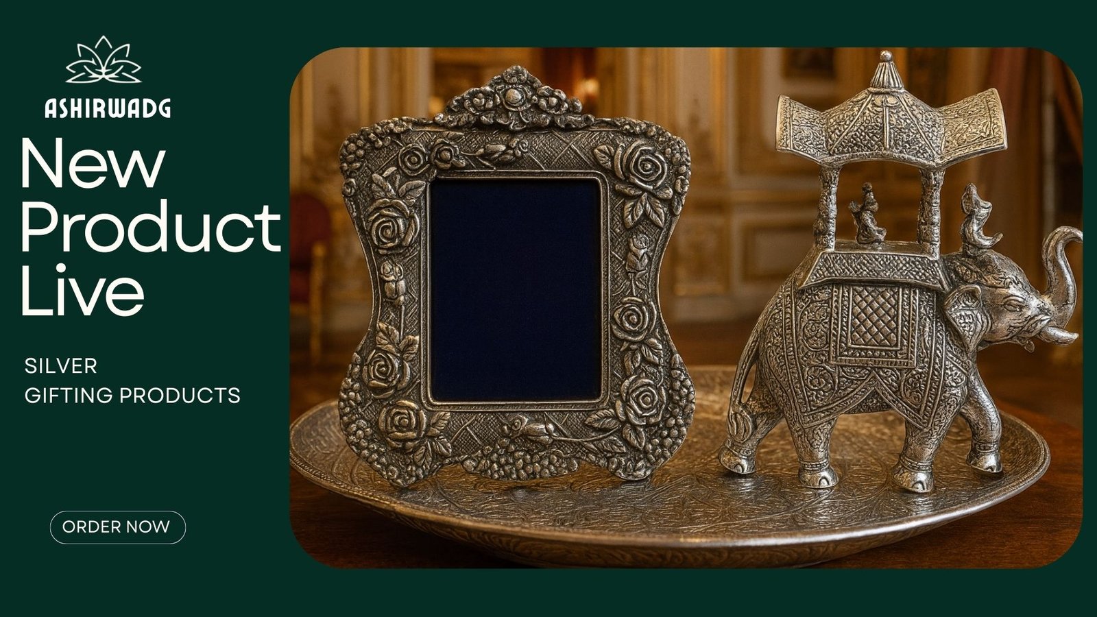 A luxury set of antique-style silver decorative pieces including an ornate photo frame, traditional figurines, a miniature palki, and a royal elephant showpiece