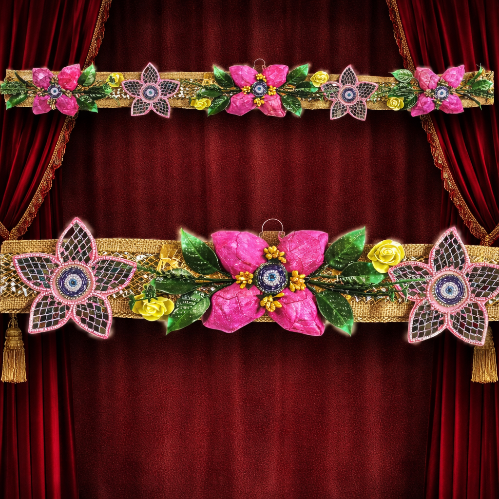 The Handcrafted Pink Flower Toran is a testament to timeless artistry blended with contemporary designs. Carefully arranged pink flowers are interwoven with durable thread, making the piece not only visually striking but also resilient for long-term use. Its vibrant floral accents exude richness and refinement, while maintaining the charm of hand-made authenticity. Perfect for adorning entrances, mandirs, or any indoor space, this toran celebrates tradition while appealing to modern tastes.